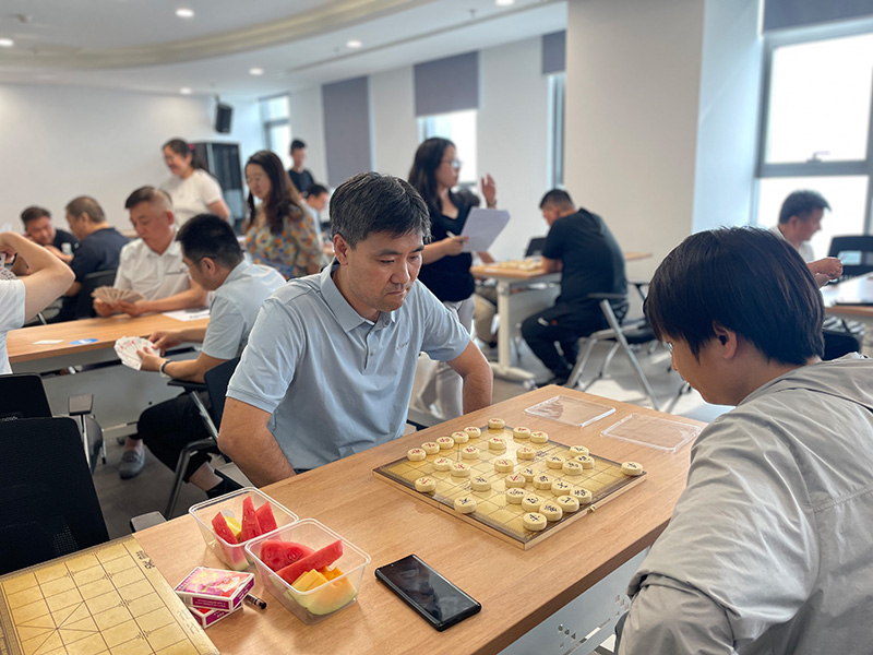 “楚河對漢界、摜蛋斗地主”。棋牌比賽中,大家“切磋棋藝,以牌會友”,個個沉著冷靜,思路敏捷。在楚河漢界之間縱橫車馬、調(diào)兵遣將;在方寸撲克之中,聚精會神,沉著應戰(zhàn),憑借默契的配合,讓“戰(zhàn)局”高潮迭起。