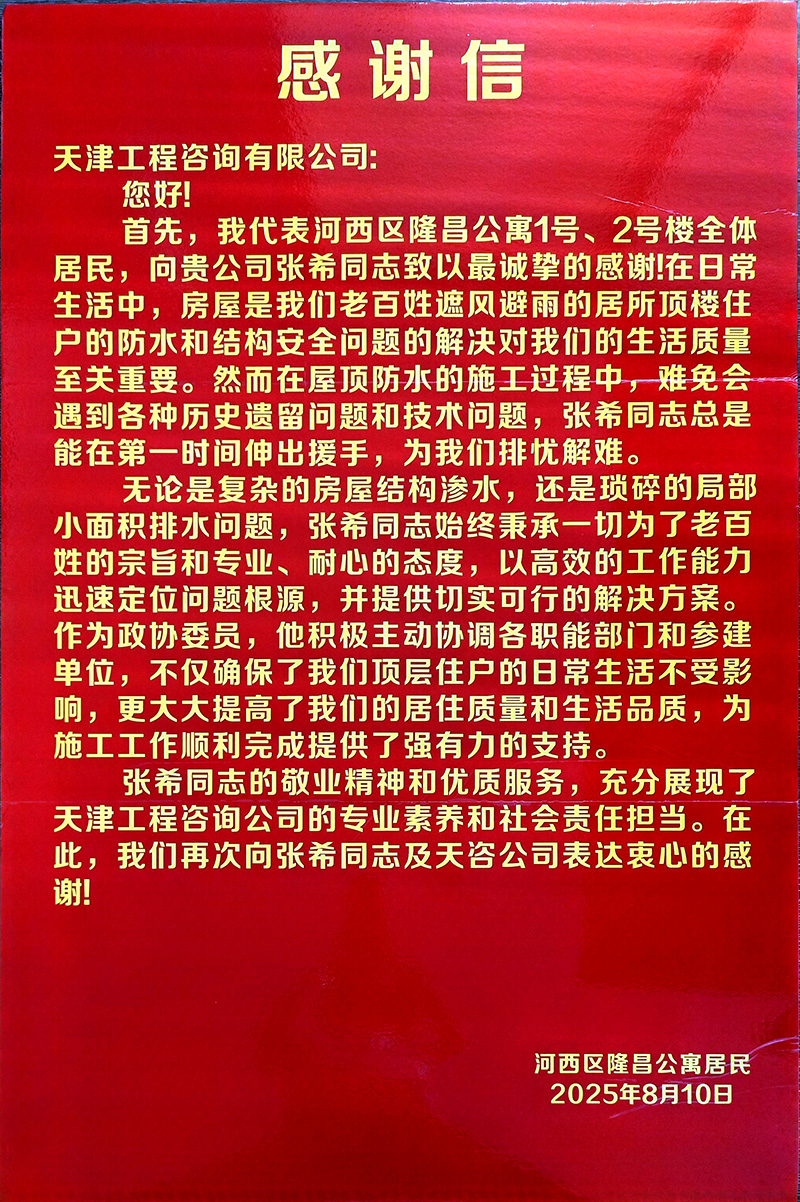 為有效促進(jìn)工程進(jìn)展,項(xiàng)目團(tuán)隊(duì)主動(dòng)加強(qiáng)與居民、街道和社區(qū)的多層次溝通。在各小區(qū)設(shè)立聯(lián)絡(luò)點(diǎn),及時(shí)公開施工與監(jiān)理信息,迅速響應(yīng)居民關(guān)切。如隆昌公寓屋面滲水問(wèn)題,團(tuán)隊(duì)僅用三天便協(xié)調(diào)解決,展現(xiàn)出高效務(wù)實(shí)的作風(fēng)。施工前主動(dòng)告知計(jì)劃,協(xié)助居民做好防護(hù),合理安排作業(yè)時(shí)間避開休息時(shí)段,還為年長(zhǎng)體弱居民提供搬運(yùn)幫助。這些細(xì)致入微的服務(wù)贏得了居民的廣泛贊譽(yù),特地送來(lái)感謝信,表?yè)P(yáng)團(tuán)隊(duì)“專業(yè)、耐心、高效”。