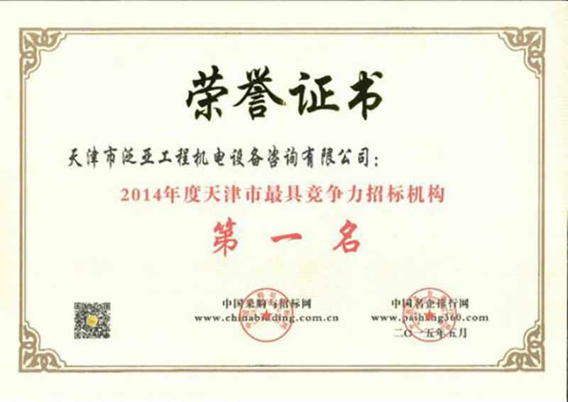 2014年度天津市最具競爭力招標機構(gòu)第一名