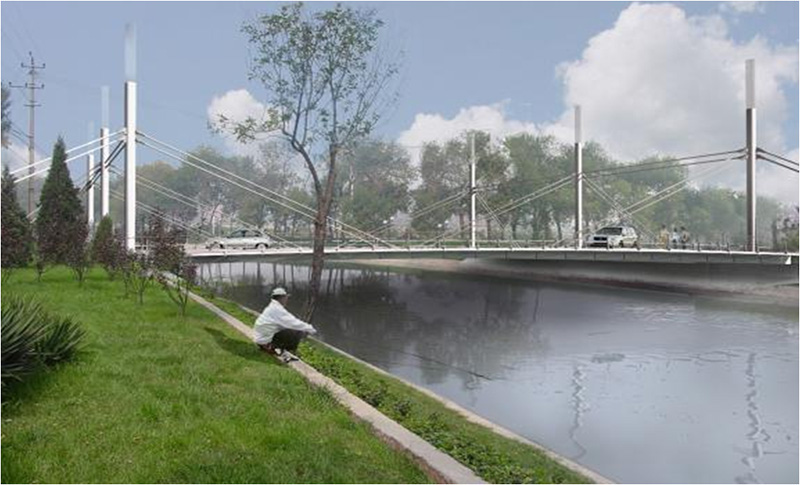 全長46.726米,寬39 米,總投資3008萬元,該工程的主體部分為空間體系小跨徑多塔斜拉橋,橋塔為圓形鋼管混凝土結(jié)構(gòu)、塔前、背索及塔間索的錨固端與橋塔相連。