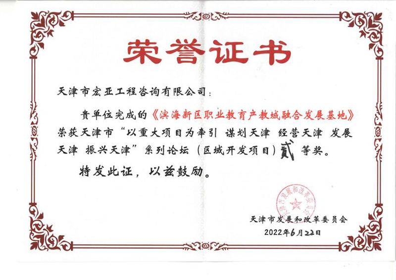 基地》項(xiàng)目榮獲天津市發(fā)展和改革委員會(huì)頒發(fā)的天津市“以重大項(xiàng)目為牽引 謀劃天津 經(jīng)營天津 發(fā)展天津 振興天津”系列論壇(區(qū)域開發(fā)項(xiàng)目)貳等獎(jiǎng)。