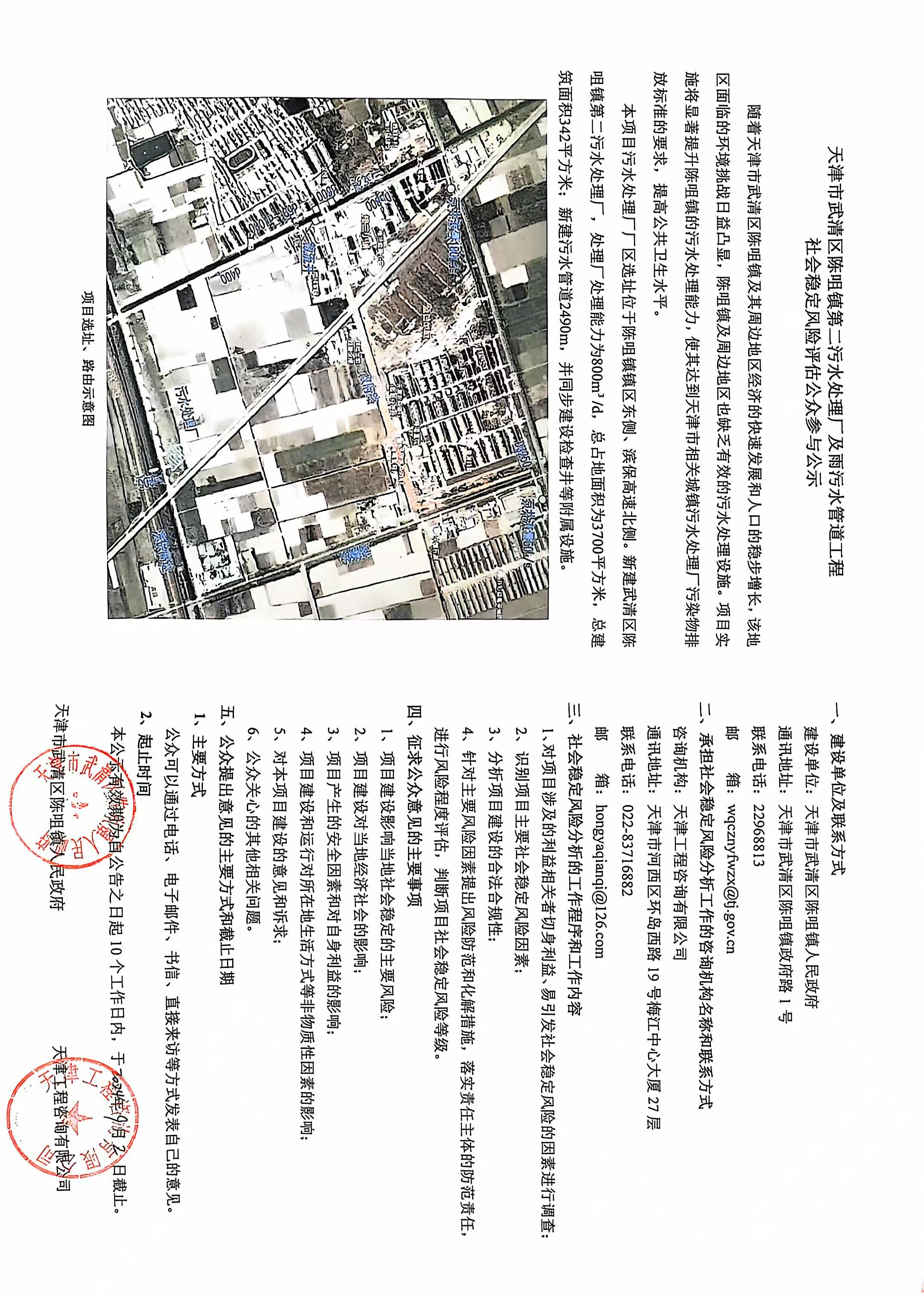 關(guān)于天津市武清區(qū)陳咀鎮(zhèn)第二污水處理廠及雨污水管道工程社會(huì)穩(wěn)定風(fēng)險(xiǎn)評估公眾參與的公示