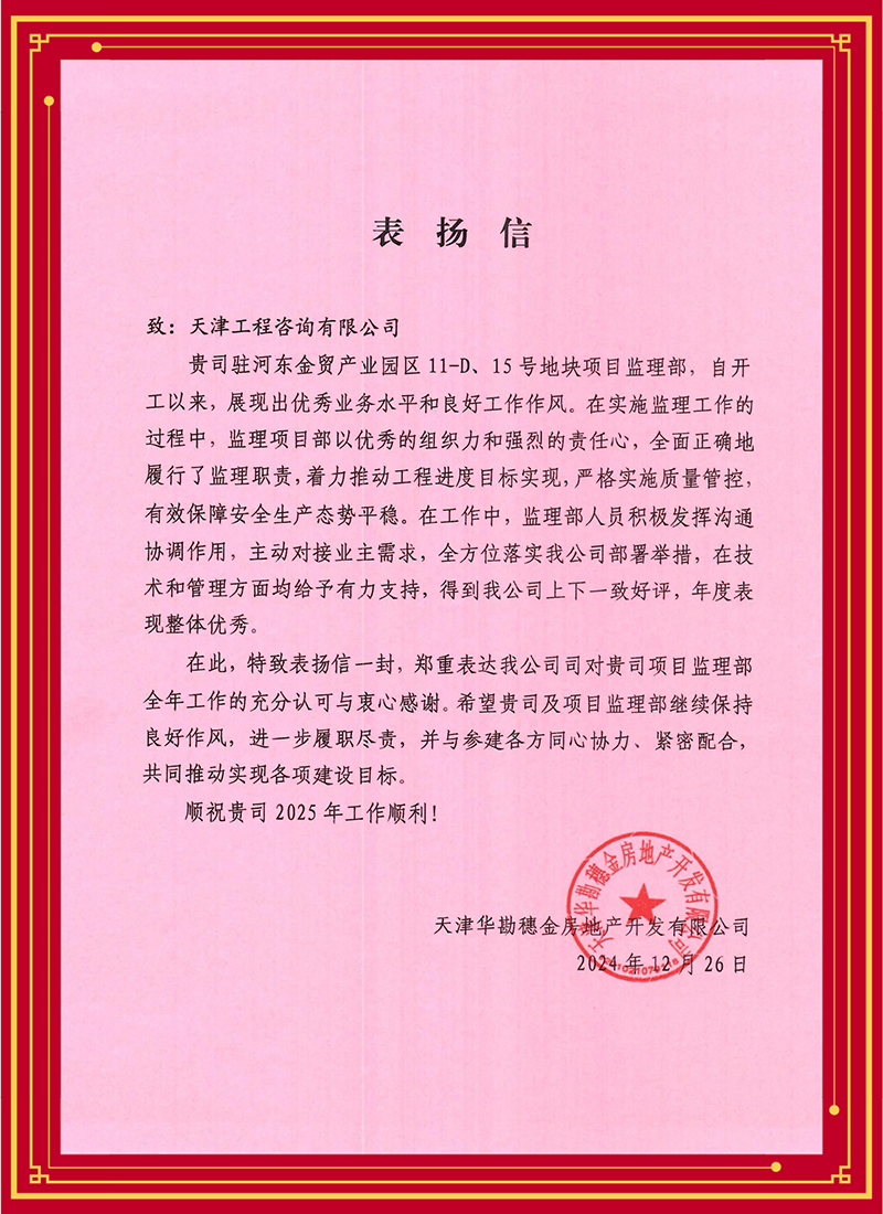 2024年,為持續(xù)深化“1264”戰(zhàn)略體系特別是“六化”舉措,加快推進(jìn)實(shí)體化進(jìn)程,天津咨詢順利完成吸收合并下屬成套監(jiān)理公司,在持續(xù)打造天津咨詢品牌,以工程監(jiān)理和項(xiàng)目管理為基礎(chǔ),發(fā)揮在項(xiàng)目建設(shè)期的綜合專業(yè)優(yōu)勢,逐步形成“監(jiān)”“管”一體化服務(wù)模式方面邁出關(guān)鍵一步。近期,多家業(yè)主單位先后發(fā)來感謝信、表揚(yáng)信,對(duì)天津咨詢承擔(dān)工程建設(shè)監(jiān)理任務(wù)給予充分肯定。