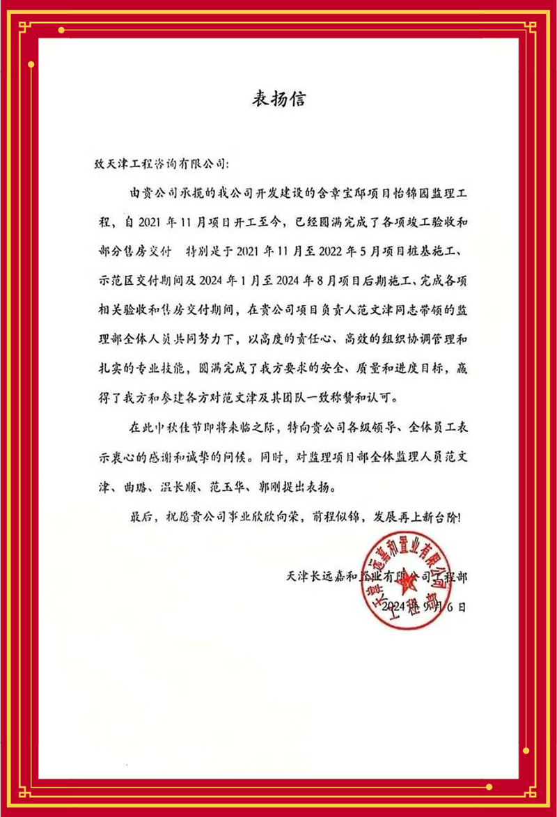津?yàn)I輕軌9號(hào)線信號(hào)系統(tǒng)更新改造工程項(xiàng)目部感謝監(jiān)理團(tuán)隊(duì)多舉措解決項(xiàng)目施工作業(yè)接口復(fù)雜、改造期間運(yùn)能不降、新舊系統(tǒng)無縫切換等難題,力保施工、運(yùn)營“雙安全”;天津長遠(yuǎn)嘉和置業(yè)有限公司贊賞含璋寶坻項(xiàng)目怡錦園項(xiàng)目監(jiān)理團(tuán)隊(duì)以高度的責(zé)任心、高效的組織協(xié)調(diào)管理和扎實(shí)的專業(yè)技能推動(dòng)項(xiàng)目圓滿完成;天津華勘穂金房地產(chǎn)開發(fā)有限公司感謝監(jiān)理項(xiàng)目部主動(dòng)對(duì)接業(yè)主需求,有效管控質(zhì)量安全,切實(shí)保障施工進(jìn)度,很好地履行監(jiān)理職責(zé)......