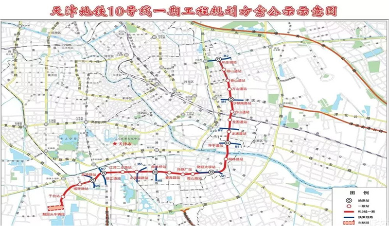天津地鐵10號線為城區(qū)西南至東北方向的軌道交通骨干線,南起西青區(qū)梨園頭,最終進入北部新城地區(qū),全長43.2公里。地鐵10號線南段工程由梨園頭至嶼東城,從衛(wèi)國道途經(jīng)沙柳路、天鋼柳林、珠江道、麗江道、梅江至梨園頭車輛段,線路全長約21公里,其中地下線20.3公里,過渡線及地面線0.7公里,共設(shè)21座車站(20個地下站,1個地面站),設(shè)梨園頭車輛段,與地鐵1、2、4、5、6號線換乘。